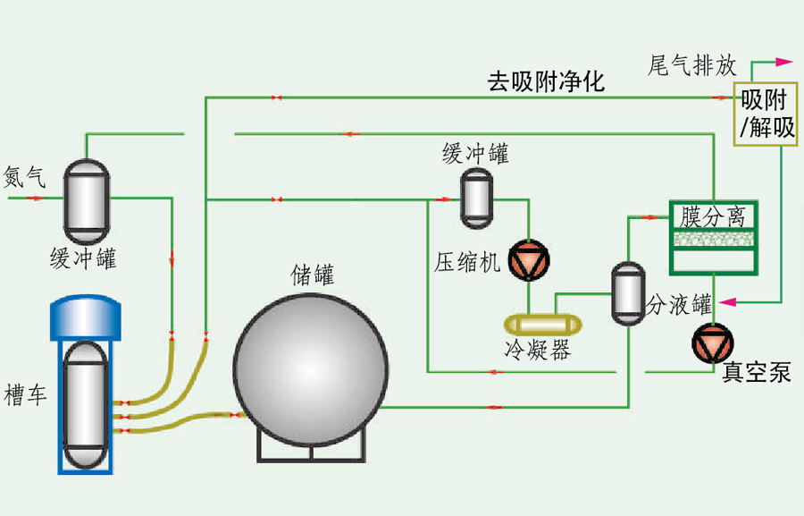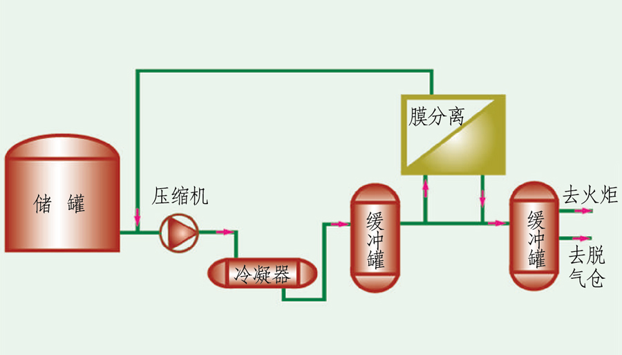 儲罐卸壓排放氣或汽車卸凈后的尾氣經(jīng)緩沖罐后,進入壓縮/冷凝,然后通過氣液分離罐將液相產(chǎn)品分離出去。分液罐的不凝氣進入膜分離系統(tǒng),滲透氣和真空解吸氣返回到壓縮機入口:膜分離系統(tǒng)的尾氣為提濃氮氣,非甲烷烴低于15q/㎡送至氮氣緩沖罐或進一步送吸附凈化<60mg/m,油氣總烴回收率大于97%。