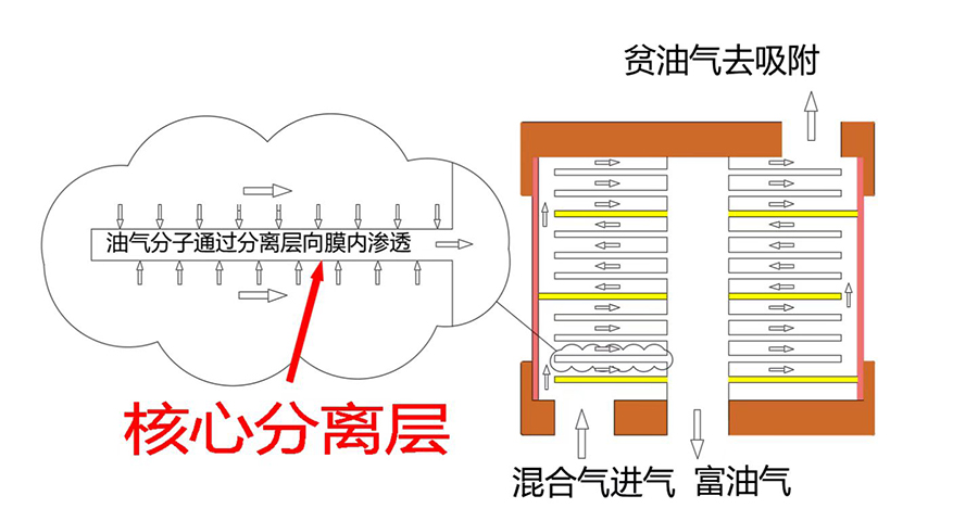 核心分離層采用硅橡膠復合膜技術(專利號:ZL 2015 1 0856947.7),硅橡膠功能層(膜分離器核心)與支撐基層結(jié)合成膜后具有超薄(裝填密度大)、牢固(壽命長)及無缺陷(分離性能高)的優(yōu)點。在此基礎上制作加工的疊式膜分離器,應用在有機蒸汽(VOCs)分離過程中,能很好的滿足其處理量大、分離系數(shù)高以及氣體組分復雜工況下的長壽命工藝要求,目前是國內(nèi)VOCs治理領域內(nèi)不可替代的、唯一能替代進口的膜分離器產(chǎn)品。