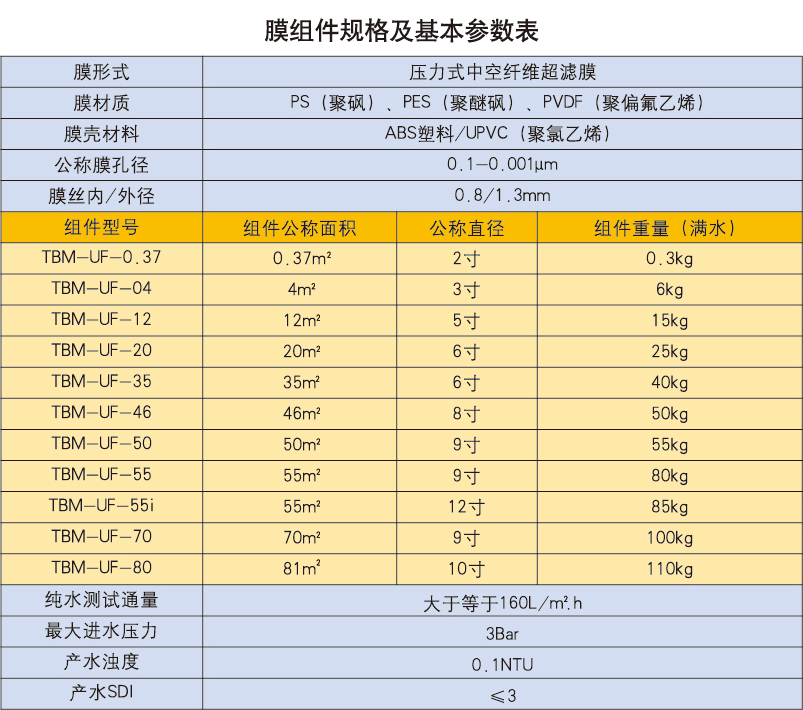 TBM超濾膜元件規(guī)格與型號