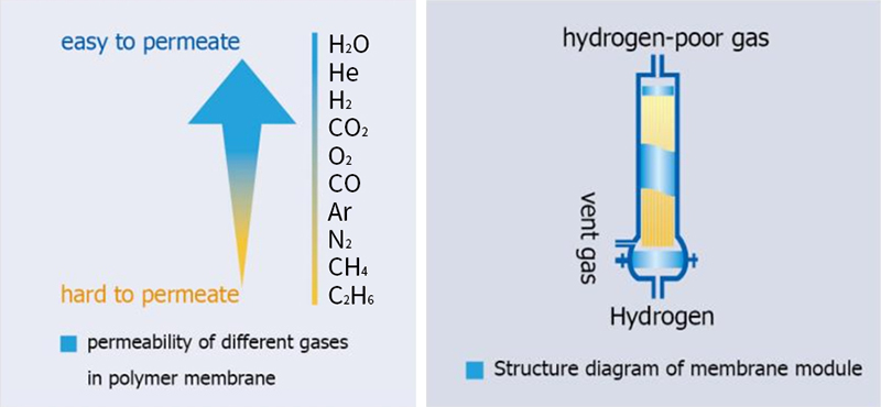 When two or more than two mixed gases pass through membrane, the permeant rate of different gases are diverse because of their solubility and diffusion rates difference. Under the impetus----pressure difference between two sides of membrane, gases whose permeant rate are comparatively quick, for example water vapor, hydrogen, helium and carbon dioxide, etc. pass through to the other side of membrane and enriched first; while gases whose permeant rate are low, for example methane, nitrogen and carbon monoxide stay and concentrated. The mixed gases are separated.